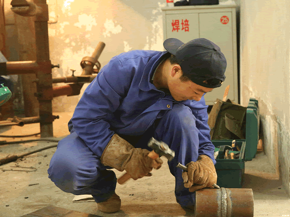 一身藍色粗布工作服,手持電焊工具,穿梭在各個電焊現(xiàn)場,或親手上活,或指點同志,或手把手示范教學,42歲的袁培東是整個九冶建設有限公司人心中的技術能手。
