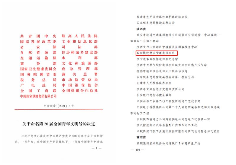 在2019—2020年度全國青年文明號創(chuàng)建評選中,咸陽城投物業(yè)管理有限公司憑借堅定的政治素質(zhì)、良好的職業(yè)道德、專業(yè)的職業(yè)技能、過硬的工作作風(fēng)、優(yōu)秀的崗位業(yè)績獲得“第20屆全國青年文明號”榮譽(yù)稱號!